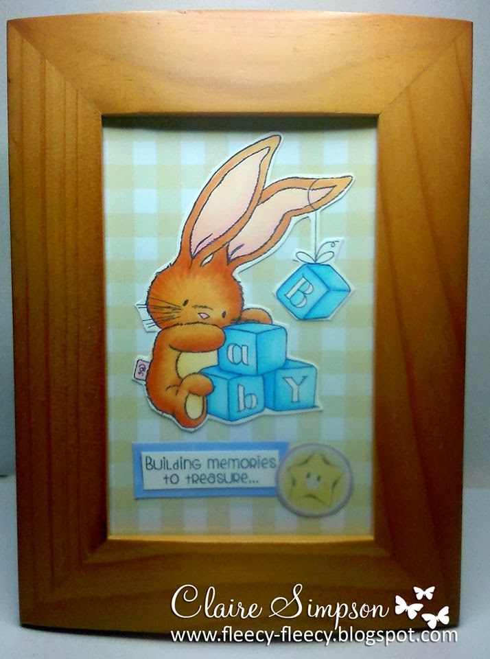 from Crafters Companion, the backing paper and star is from the Bebunni Baby CD and I ahve coloured him in with Spectrum Noirs - TN2 thought to 5 and GB1 & 2 for his tummy and not forgetting his ears CR2-4. The blocks are coloured with TB1,2 & 3.
